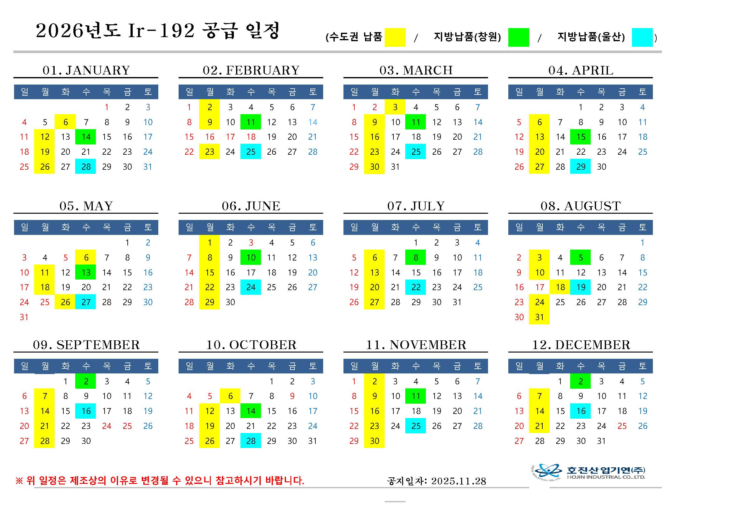2026년도 Ir-192 대체 공휴일을 포함한 공급일정 입니다. 업무에 참고해 주시기 바랍니다.